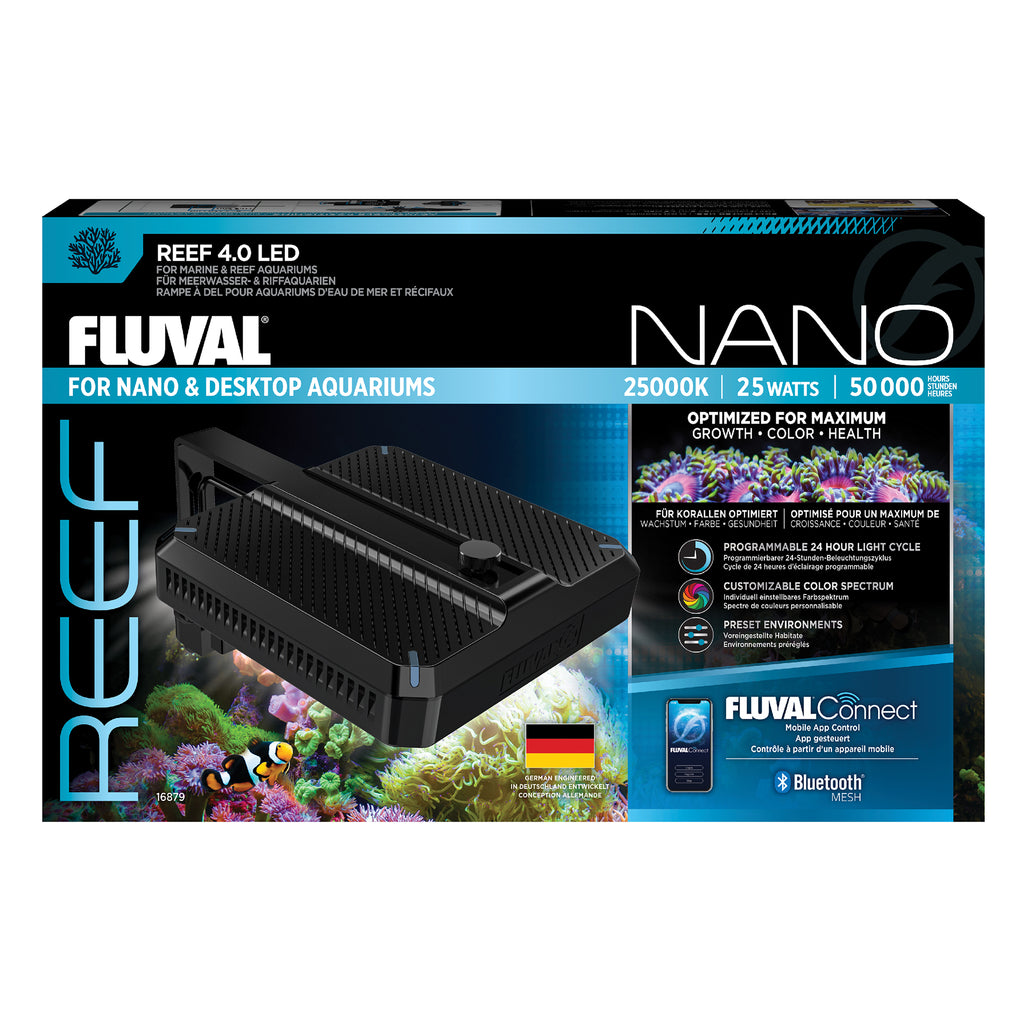 The Reef 4.0 Nano LED isn't just lighting – it's the key to a thriving small saltwater aquarium. With a full spectrum that includes the critical actinic range, it fuels peak coral photosynthesis to bring out their optimal color, growth and health potential. Plus, exclusive FluvalConnect mobile app control offers complete customization and added convenience.